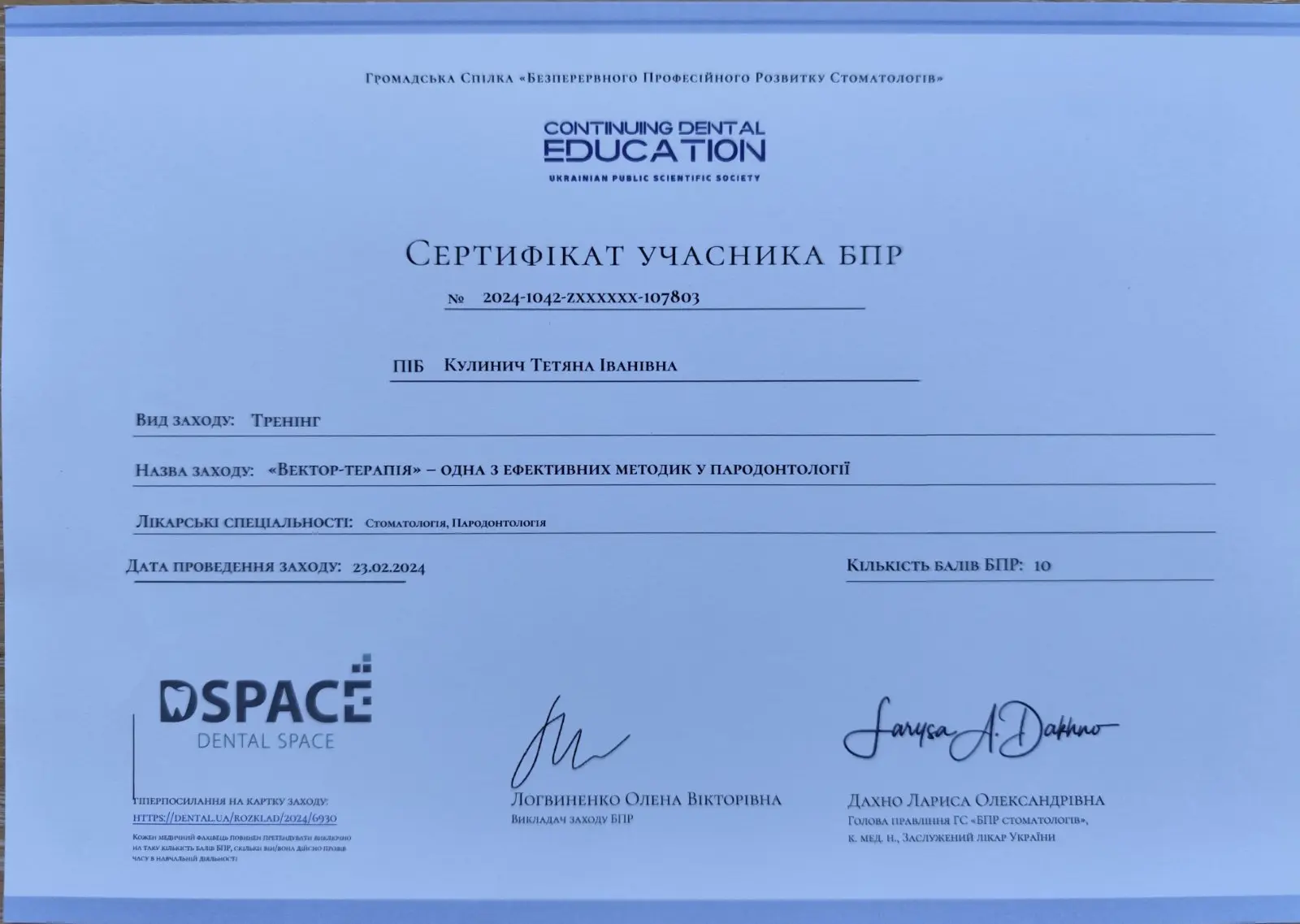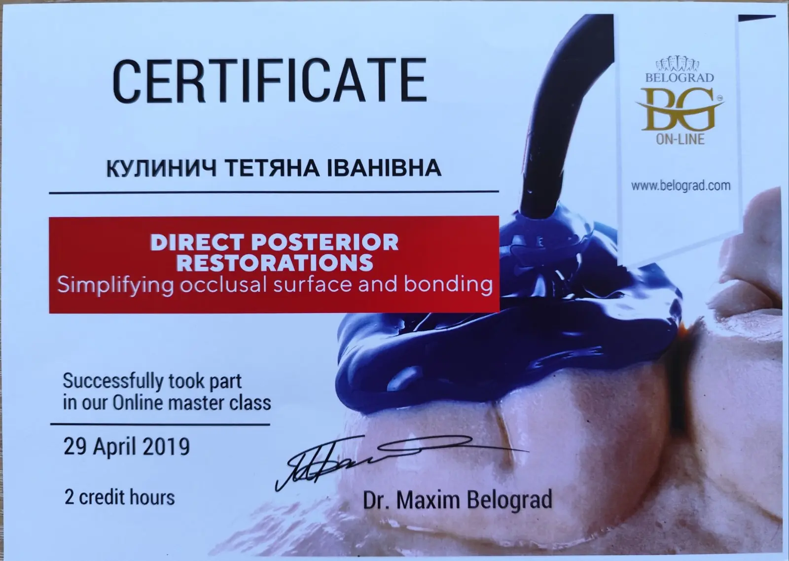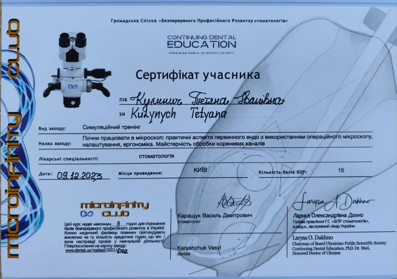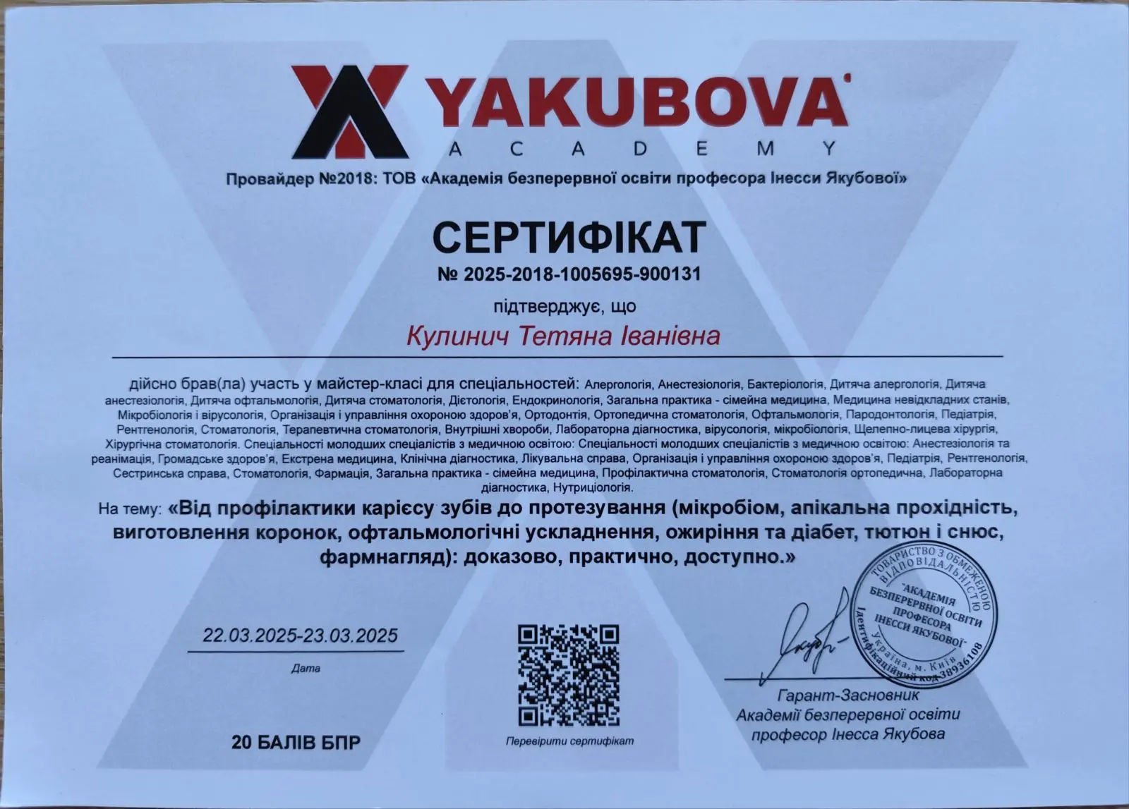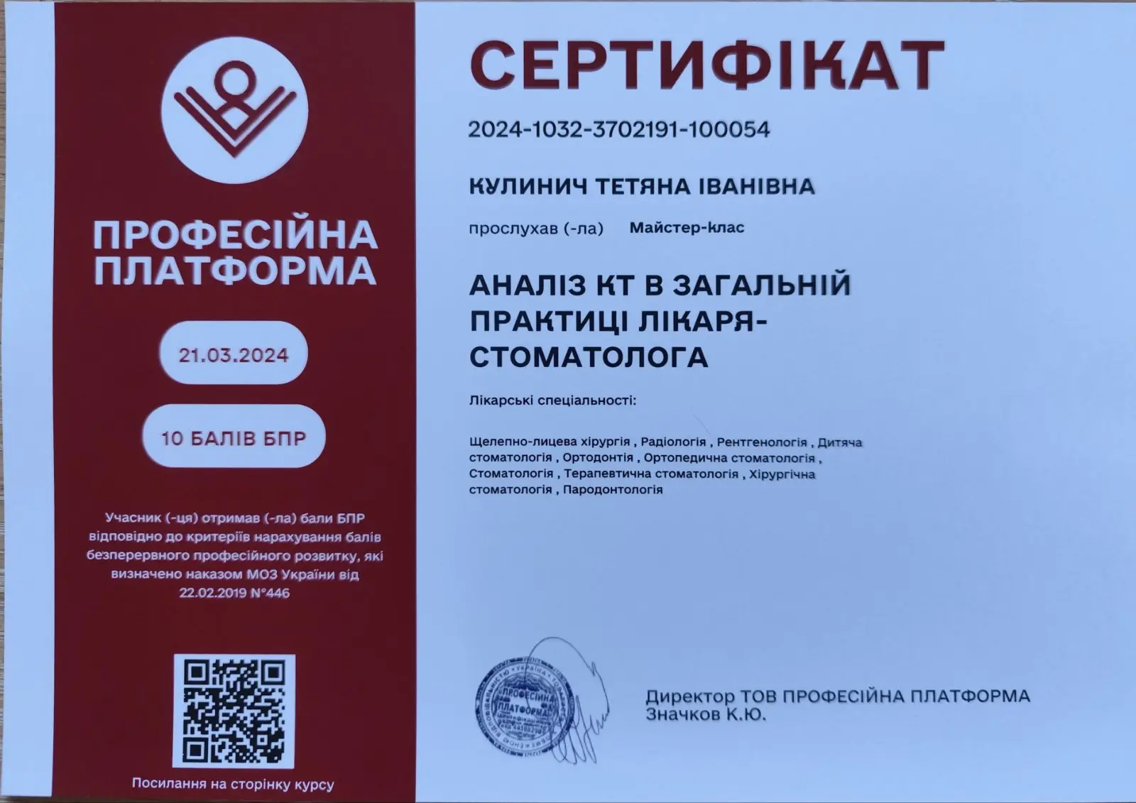 Я вірю, що стоматологія має бути дружньою і зрозумілою. Тому завжди пояснюю всі кроки лікування простою мовою, відповідаю на запитання і створюю атмосферу довіри.