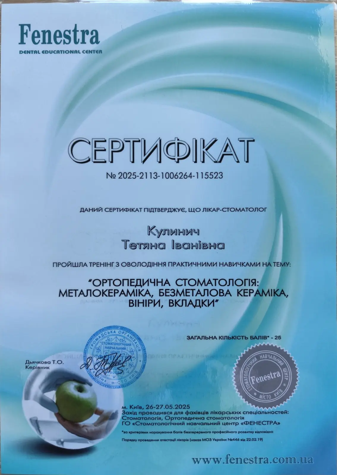 Моя головна мета — щоб кожен пацієнт відчував себе у кріслі спокійно та без страху. Я добре розумію, що візит до стоматолога для багатьох асоціюється з тривогою, тому завжди ставлюсь до лікування максимально уважно та делікатно.
